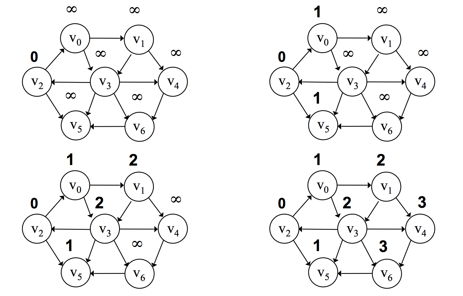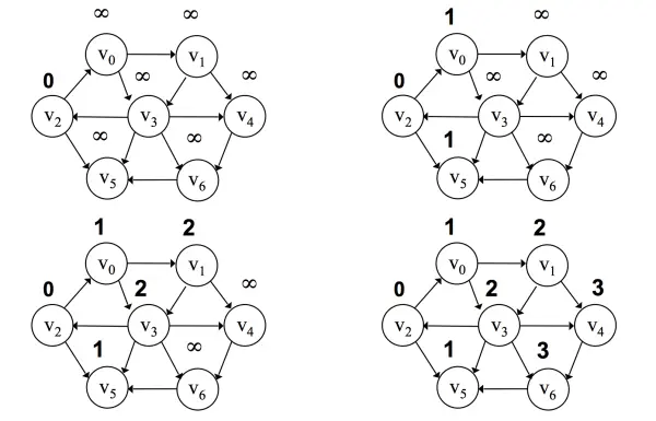 - 增加 shortest 的值,重复步骤 3,直到没有顶点的距离值为无穷大