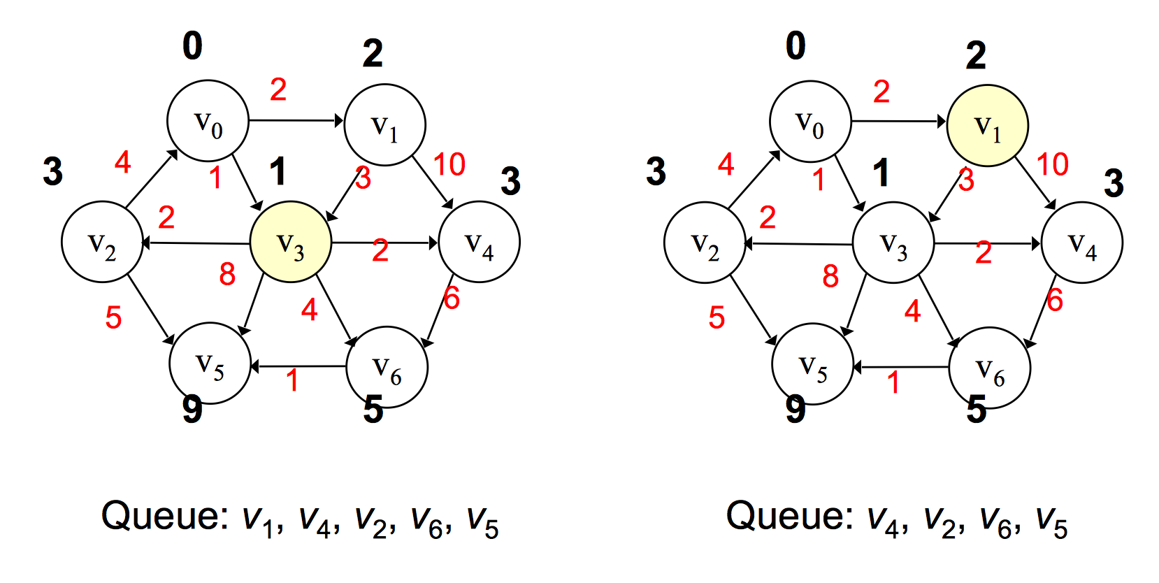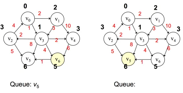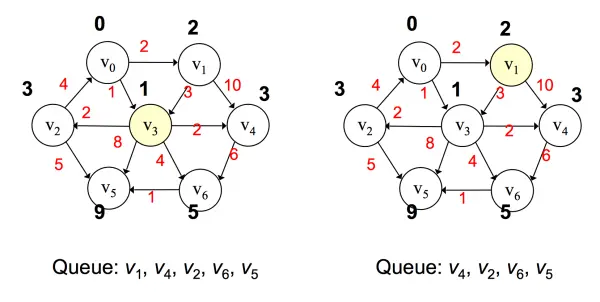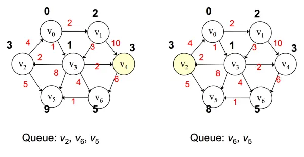 之后将 v3 弹出,对所有 v3 邻接点进行值的更新,并将所有邻接点按路径大小升序添加到优先队列中,若遇到值相同,则无所谓其先后顺序