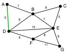 在对所有边进行排序之后,我们得到一个边集合,从边集合中取出最小权的边 AD