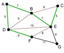 剩下的边中寻找。我们找到了 CE。这里边的权重也是 5,依次类推我们找到了 6,7,7