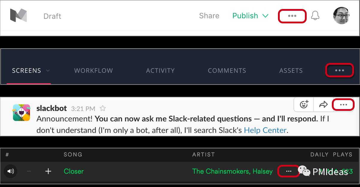 现在,越来越多的产品使用一个中线省略号(⋯)来表明还有更多菜单选项可供选择,就好像是说”嗨,这里还有更多你可以做的事情。“