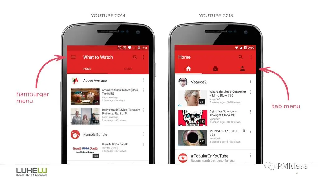 然而实验表明,如果以更明显的方式来显示菜单栏选项,用户的使用度和满意度都会得到提升,甚至能增加收入。这就是为何YouTube已经舍弃掉原本的汉堡菜单栏,转而将最重要的导航选项提出来一直可见。
