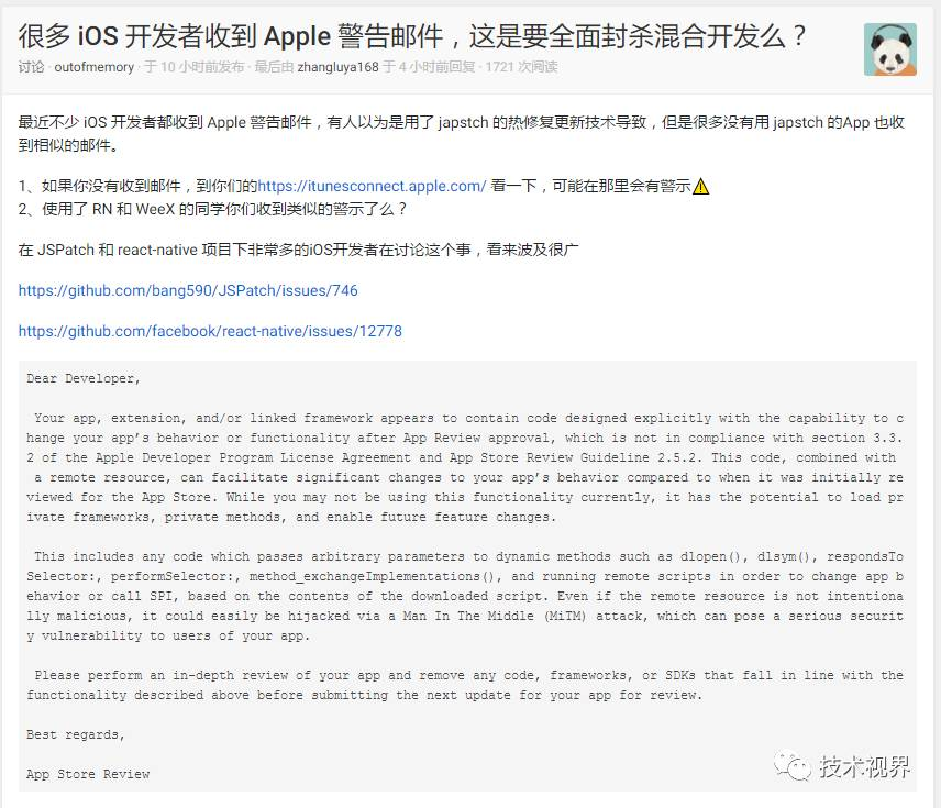 最近不少iOS开发者收到苹果的警告邮件,事情的起因是使用了JSPatch、React Native、Weex等热修复技术,虽然苹果只是发了警告邮件,并没有听到哪些应用被直接下架,但还是在开发圈子里掀起波澜,很多开发者在大大小小的社区里面纷纷议论这事。