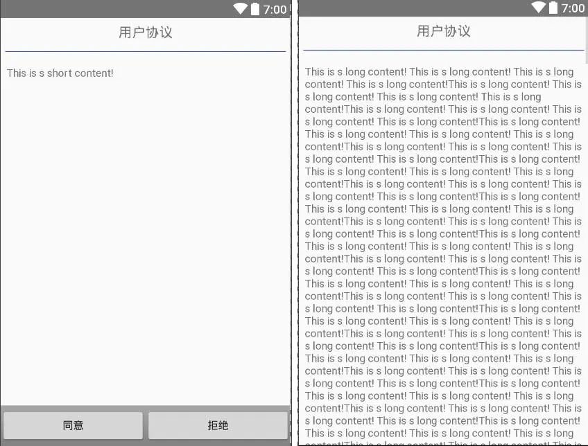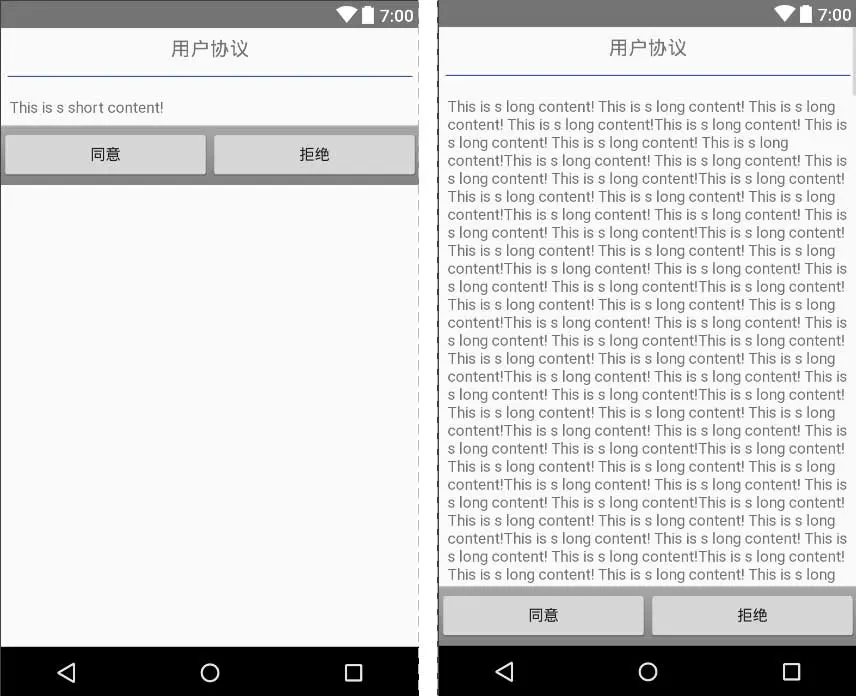 简单说明一下,这种界面,或者说类似的界面很常见,中间内容长度不固定,或者说相同内容在不同设备上屏幕占比不一致,导致底部操作按钮位置也不尽相同。比如,这个界面的产品重点是希望用户能够读完协议内容,然后再做出下一步操作。也就是说,你不能做成这个样子: