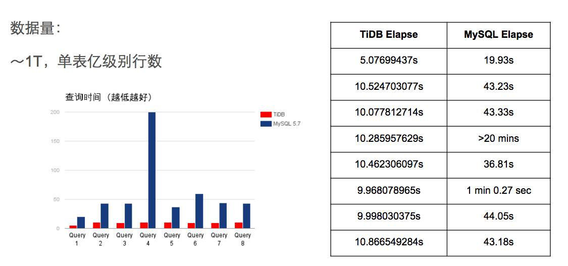 (图为 TiDB 与 MySQL 在不同数据量下的查询时间对比)