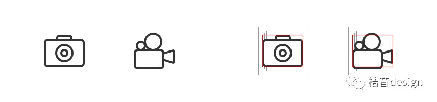 相机和放映机的icon,咋一看,都是线性的,圆角也一样的,但是就是不对劲,如果你感官敏感一点就能感觉,放映机的icon比相机的icon大一点。