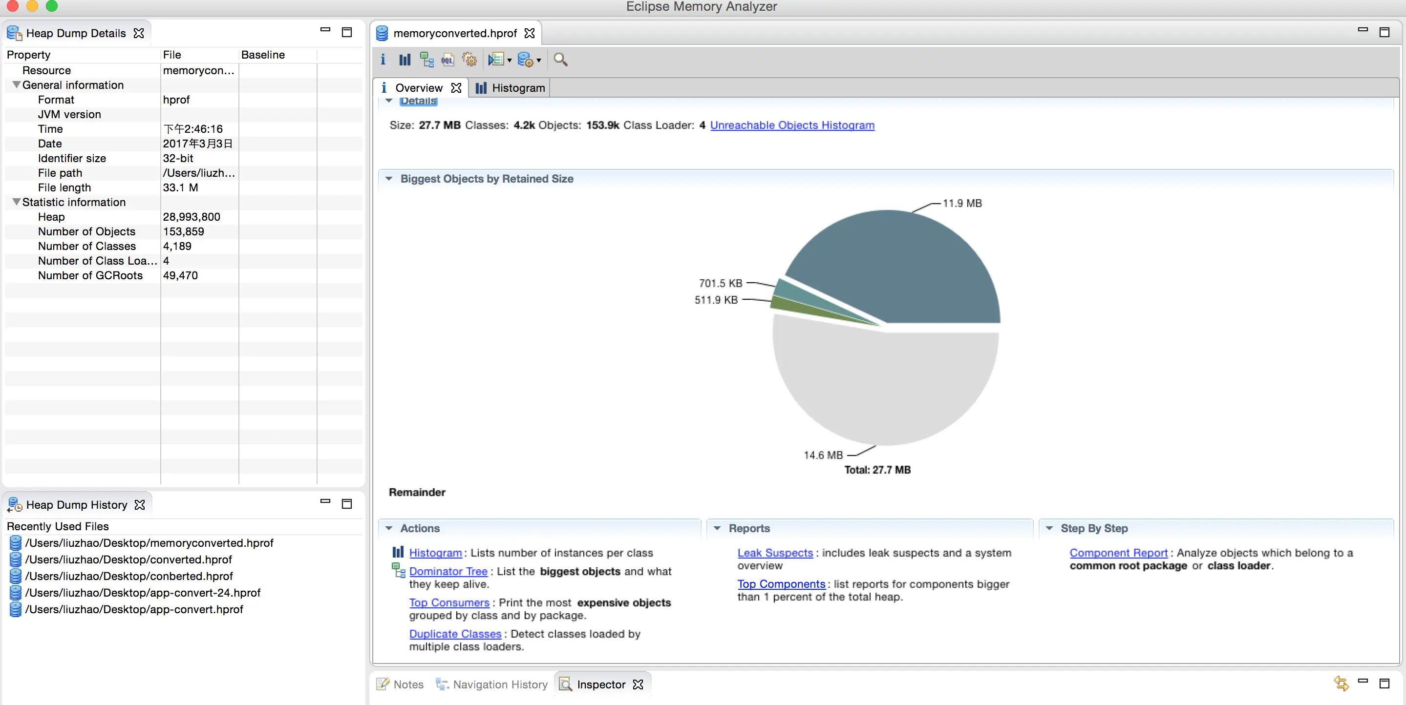 上述只是可以粗略的看出是不是有问题,而要知道问题出在哪里就需要借助MAT了。将生成的.hprof文件进行转换,然后使用MAT打开;