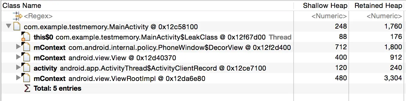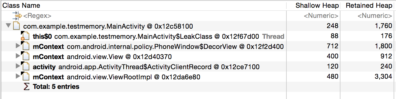this$0前面的图标的左下角有个圆圈,这代表这个引用可以被Gc Roots引用到,由于MainActivity$LeakClass能被GC Roots访问到导致其不能被回收,从而它所持有的其它引用也无法被回收了,包括MainActivity,也包括MainActivity中所包含的其它资源。