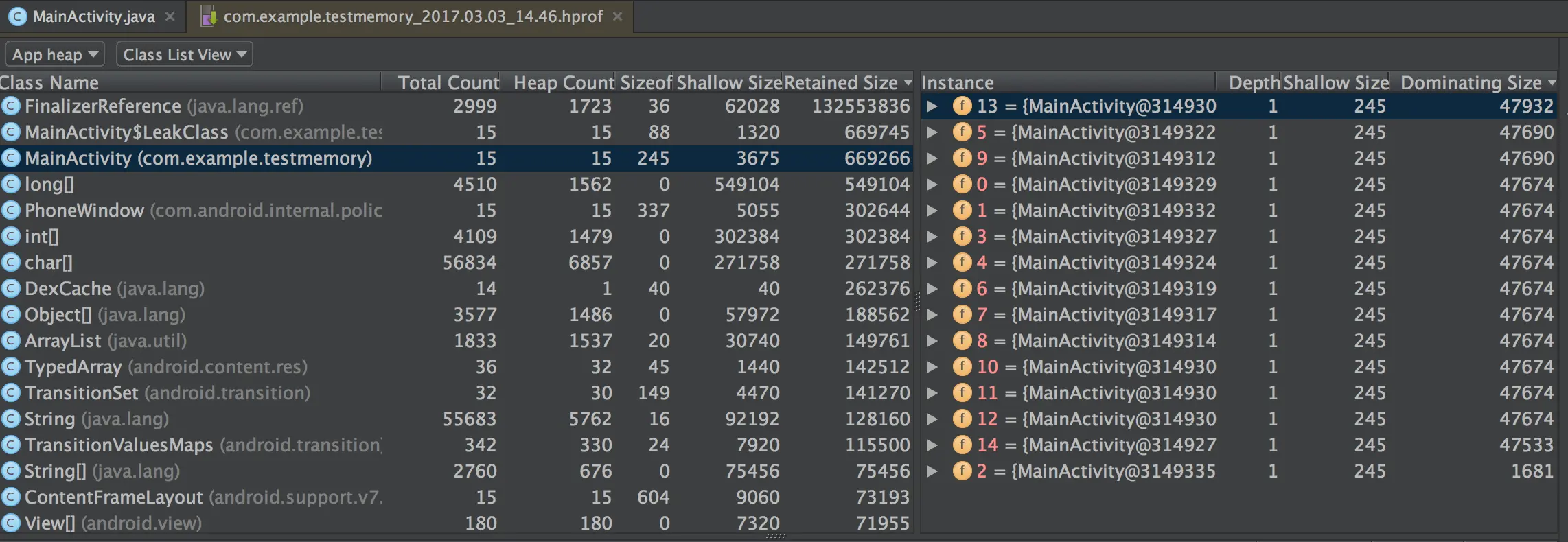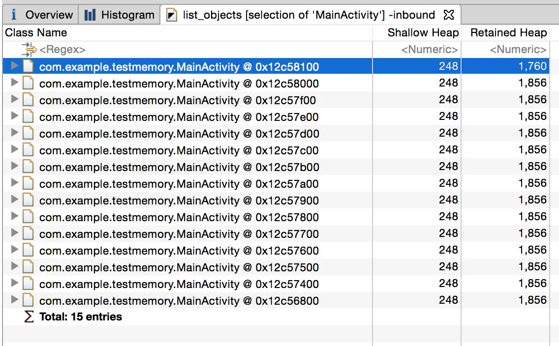 - 点击Histogram并在顶部的Regex中输入MainActivity会进行正则匹配,会将包含“MainActivity”的所有对象全部列出了出来,其中第一行就是MainActivity的实例。