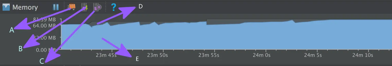 - C:Start Allocation Tracking 内存分配追踪工具,用于追踪一段时间的内存分配使用情况,能够知道执行一些列操作后,有哪些对象被分配空间。一般用于追踪某项操作之后的内存分配,调整相关的方法调用来优化app性能与内存使用;