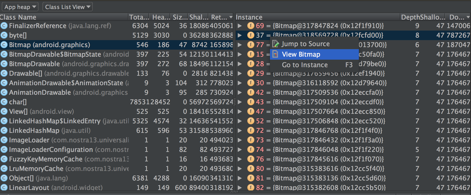 一些实现方式看起来没有问题实现了功能但是实际上可能对内存造成了影响。我在使用Heap Viewer查看Bitmap对象时发现了一张只需下载不应该被加载的图。