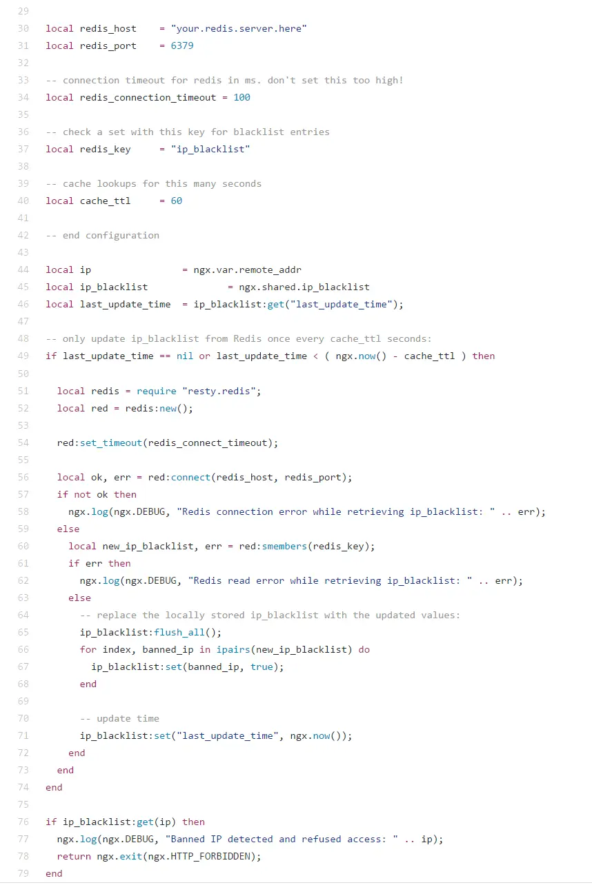 4、配置 lua 脚本,定期从 Redis 获取最新的 IP 黑名单,文件内容参见: