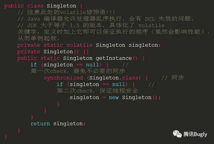 由于 Java 编译器允许处理器乱序执行,以及 JDK 1.5 之前的旧的 Java 内存模型(Java Memory Model)中 Cache、寄存器到主内存回写顺序的规定,上面步骤 2) 和 3) 的执行顺序是无法确定的,可能是 1) → 2) → 3) 也可能是 1) → 3) → 2) 。如果是后一种情况,在线程 A 执行完步骤 3) 但还没完成 2) 之前,被切换到线程 B 上,此时线程 B 对singleton第1次判空结果为 false,直接取走了singleton使用,但是构造函数却还没有完成所有的初始化工作,就会出错,也就是 DCL 失效问题。