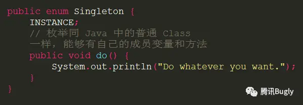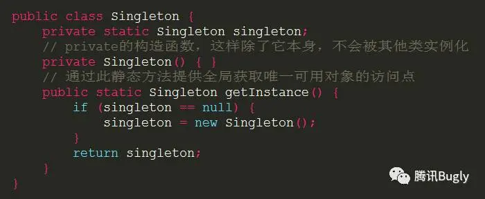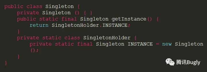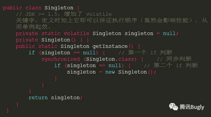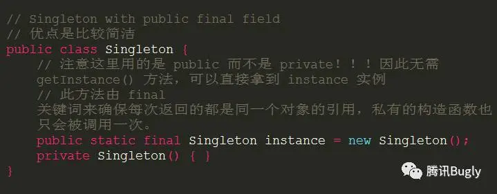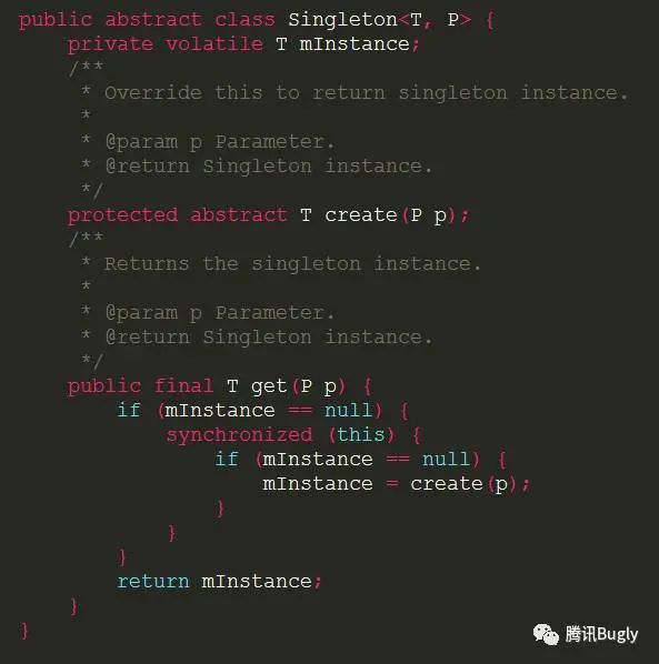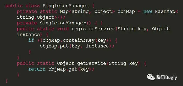 get()方法用了final来修饰,在子类中是不能被重写的,这就造成了我们应用中的所有单例用的是相同的单例方式,也就是都用了 DCL 方式来实现单例,难以想象一种单例可以适用于整个项目(此项目中的单例类包括:登录注册管理类 LoginManager,账户管理类 AccountManager,用户信息业务逻辑类 UserBusiness,主线程 Handler 类 MainHandler,数据上报 Looper 类 ReportLooper,Preference 管理类 PrefManager,WNS 数据透传管理类 SenderManager, PUSH业务逻辑类 PushBusiness,素材业务逻辑类 MaterailBusiness,搜索业务逻辑类 SearchBusiness,消息业务逻辑类 MessageBusiness 等等,DCL 显然不适用于所有这些单例。P.S. 感觉单例的使用也有点多了,需要检查一下是否有滥用)。 -