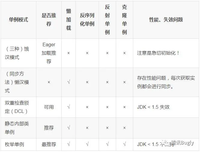 上表中仅列举那些线程安全的实现方式,永远不要使用线程不安全的单例!