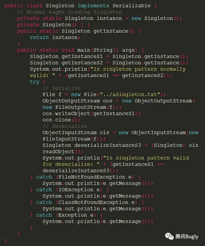 序列化一是可以将一个单例的实例对象写到磁盘,实现数据的持久化;二是实现对象数据的远程传输。当单例对象有必要实现 Serializable 接口时,即使将其构造函数设为私有,在它反序列化时依然会通过特殊的途径再创建类的一个新的实例,相当于调用了该类的构造函数有效地获得了一个新实例!下述代码就展示了一般情况下行之有效的饿汉式单例,在反序列化情况下不再是单例。