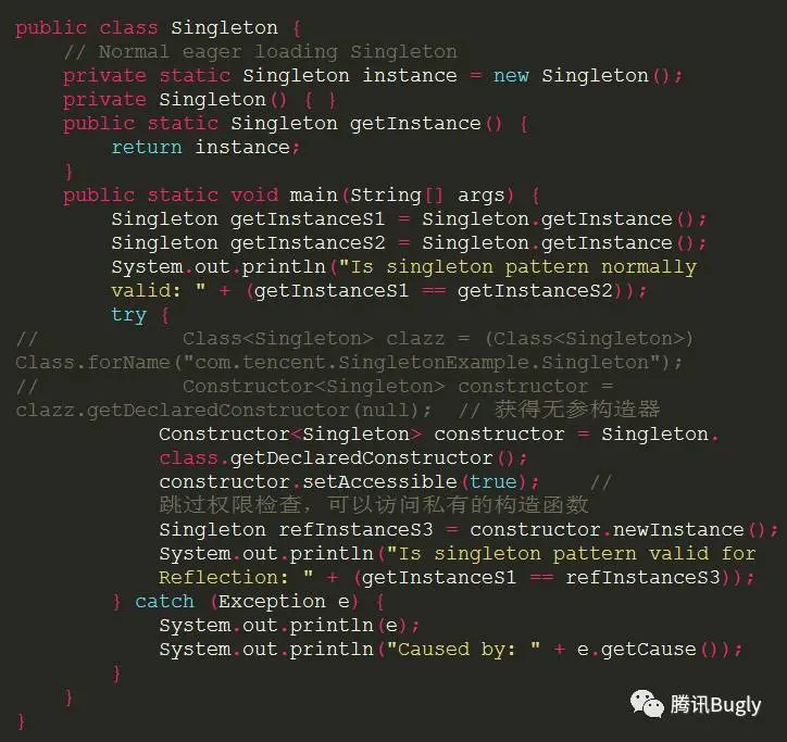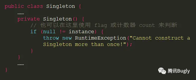 这样一旦程序中出现代码使用反射方式二次创建单例时,就会打印出:
