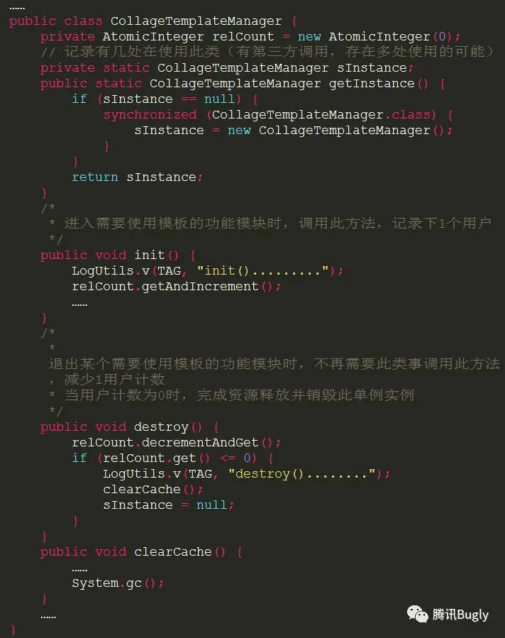 destroy()方法,可以在退出功能或使用完成时释放资源,销毁单例。以CollageTemplateManager类为例,它载入了模板描述文件、缩略图等较多的资源,而退出拼图功能模块后在其他模块中都不会再被使用。代码如下: