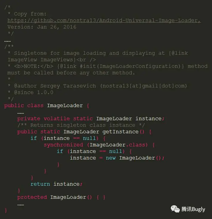 Android 中鼎鼎大名的 Universal Image Loader 和 EventBus 都是采用了这种方式的单例,下面节选的源码片段就是从它们的 GitHub 工程内拷贝过来的: