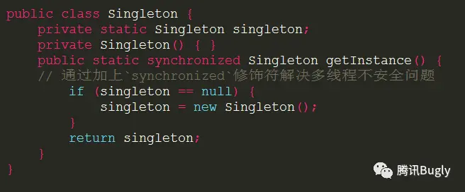 除了多并发的情况,实现单例模式时另一个重要的考量因素是效率。前述的“懒汉方式”的多线程问题可以通过加上 synchronized 修饰符解决,但考虑到性能,一定不要简单粗暴地将其添加在如下位置: