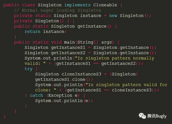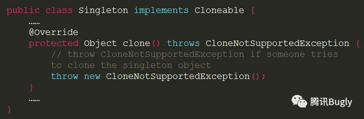 所以单例模式的类是不可以实现 Cloneable 接口的,这与 Singleton 模式的初衷相违背。那要如何阻止使用 clone() 方法创建单例实例的另一个实例?可以 override 它的 clone() 方法,使其抛出异常。(也许你想问既然知道了某个类是单例且单例不应该实现 Cloneable 接口,那不实现该接口不就可以了吗?事实上尽管很少见,但有时候单例类可以继承自其它类,如果其父类实现了 clone() 方法的话,就必须在我们的单例类中复写 clone() 方法来阻止对单例的破坏。)