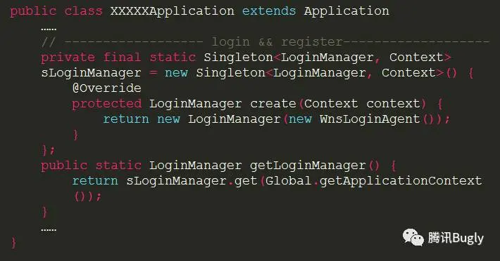 所有的单例创建都是在继承了 Application 的 XXXXXApplication 类中,以其中以用于登录和注册的单例为例,首先创建单例,使用时只需要调用 XXXXXApplication.getLoginManager() 就可以拿到实例了: