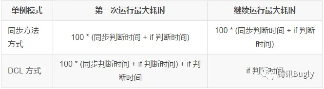 在第一次运行的时候,同步方法方式耗费的时间为:100 * (同步判断时间 + if 判断时间)。以后也保持这样的消耗不变。