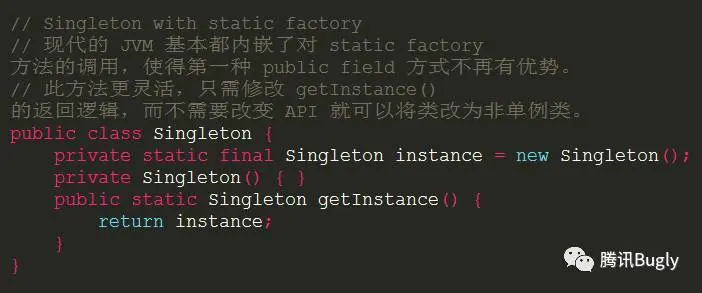 下文会详细给出的三种饿汉模式差别不大,一般使用第二种 static factory 方式