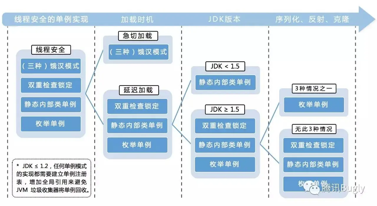 以后的版本已经被修复,但是如果还在使用 Java 1.3 之前的版本,必须建立单例注册表,增加全局引用来避免垃圾收集器将单例回收。