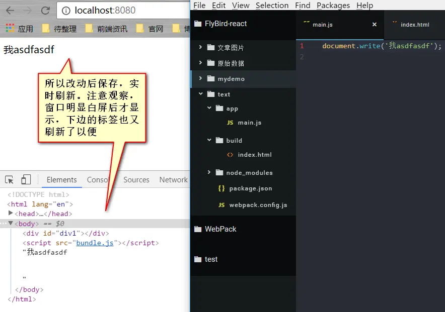 它长这样,其中的div用来给做一些页面修改什么的用// index.html <!DOCTYPE html> <html lang="en"> <head> <meta charset="UTF-8"> <title>FlyBird</title> </head> <body> <div id="div1"></div> <script src="bundle.js"></script> </body> </html>