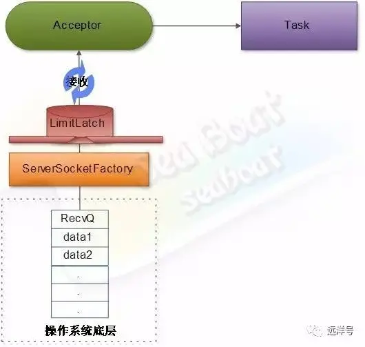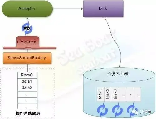 主要的职责就是监听是否有客户端套接字连接并接收socket,再将socket交由任务执行器(线程池)执行。不断从系统底层读取socket,做尽可能少的处理,再扔进线程池。为什么强调要做尽可能少的处理?这里关系到系统性能问题,过多的处理会严重影响吞吐量。因为一般只有一个接收器(一条线程负责套接字接收工作),所以它对每次接收处理的时间长短将很可能对整体性能产生影响。于是接收器所干的活都是非常少且简单的,仅仅维护了几个状态变量、流量控制闸门的累加操作、serverSocket的接收操作、设置接收到的socket的一些属性、将接收到的socket放入线程池以及一些异常处理。其他需要较长时间处理的逻辑就交给了线程池,例如对socket底层数据的读取,对http协议报文的解析及响应客户端的一些操作等等。