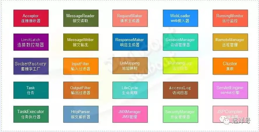 开发一个web容器涉及很多不同方面不同层面的技术,例如通信层的知识,程序语言层面的知识等等,且一个可用的web容器是一个比较庞大的系统,要说清楚需要很长的篇幅,本文旨在介绍如何设计一个web容器,只探讨实现的思路,并不涉及过多的具体实现。把它分解划分成若干模块和组件,每个组件模块负责不同的功能,下图列出一些基本的组件,并将对每个组件进行介绍。