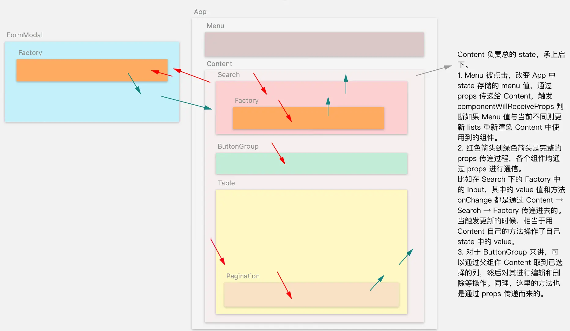 在最终的 react 组件中,按照重要程度,结构大致如上。我们通过下图来了解组件间具体如何通信。
