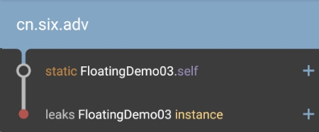 This leak is very easy to spot. self is a static field. A static field has a long lifecycle that is as long as the whole application. So even you want to finish this FloatingDemo03, Android could not GC