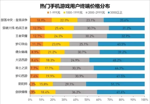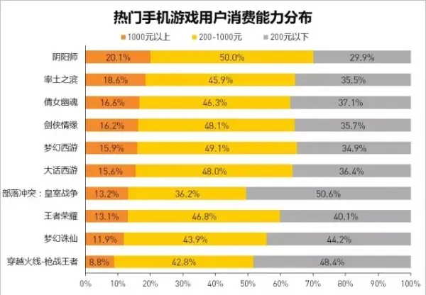 在腾讯网易的热门手游中,按照用户消费能力排列的话,分别为:《阴阳师》、《率土之滨》、《倩女幽魂》、《剑侠情缘》、《梦幻西游》、《大话西游》、《皇室战争》、《王者荣耀》、《梦幻诛仙》、《穿越火线-枪战王者》。