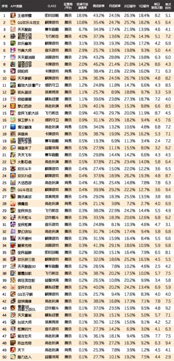 行业渗透率就是某个游戏的活跃用户数占手游行业活跃用户数的比例,而从安卓平台的用户渗透率来看,腾讯无疑占据着绝对的领先地位。《王者荣耀》的安卓行业渗透率达到18.9%,周活跃率达43.2%,次留达26.3%,单日使用次数为8.2次,综合起来,用户粘性遥遥领先。
