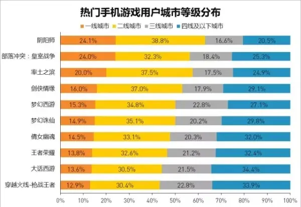 在腾讯网易TOP10的热门手游中,《阴阳师》的男女比例最均匀,男性占比53.6%,女性占比46.4%,由此可以看出,《阴阳师》颇受女性玩家欢迎。除此之外,《阴阳师》也是玩家手中群体最年轻的游戏,24岁以下占比63.4%,30岁以下占比82.7%。同时《阴阳师》玩家的已婚率最低,只有19.2%。其玩家大多分布在一二线城市,一线城市占比24.1%,二线城市占比38.8%。
