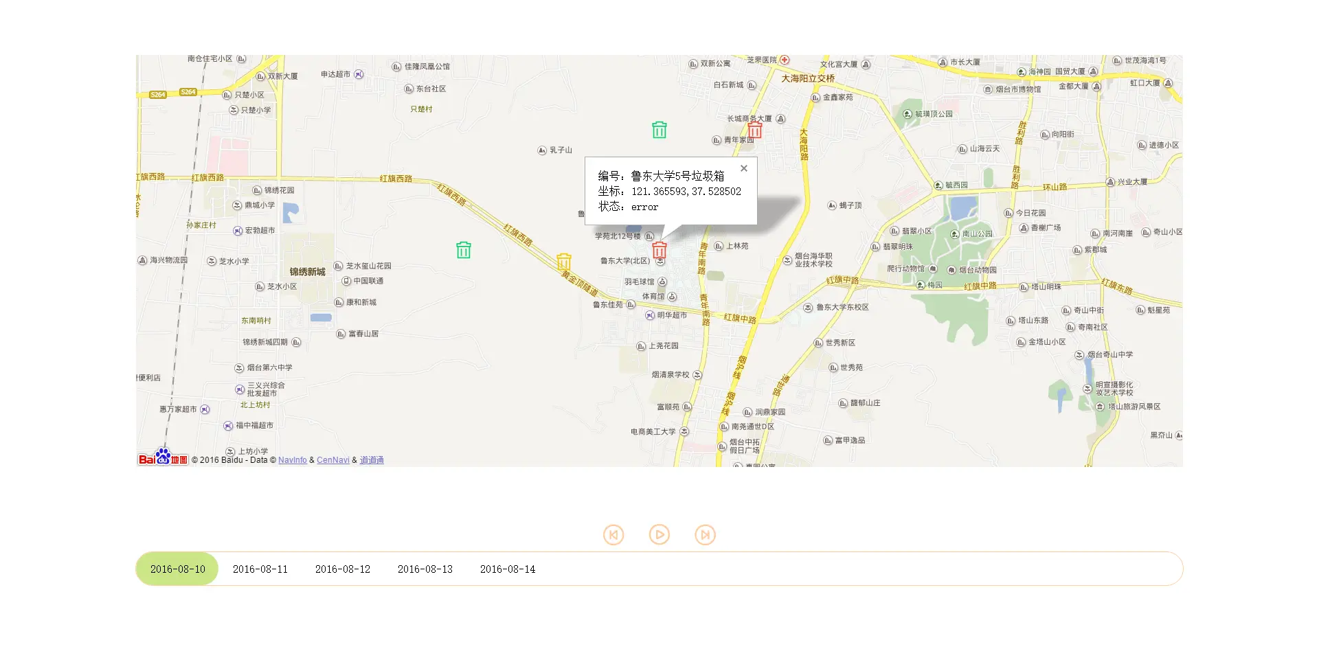 百度地图标注添加看懂了,接下来就是动态添加标注,并且随和日期的变化而变化,比如展示垃圾箱的动态变化,8.3号清理了颜色为绿色,8.6号没清理为红色..