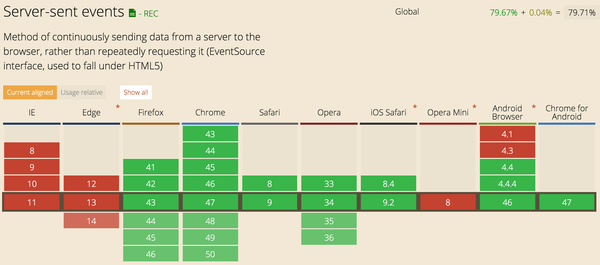 - WebSocket 在浏览器方面支持更广(详见下图),IE / Edge 几乎根本不支持 SSE