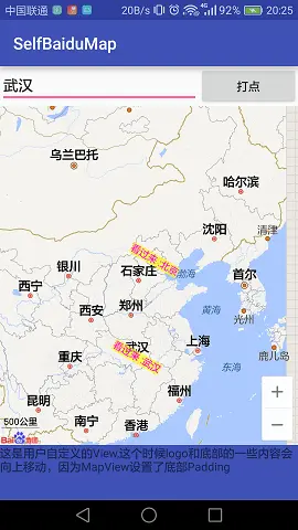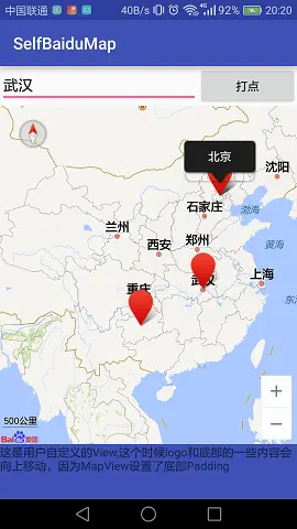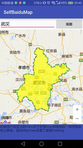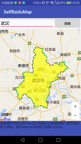 textView.setText("这是用户自定义的View,这个时候logo和底部的一些内容会向上移动,因为MapView设置了底部Padding");