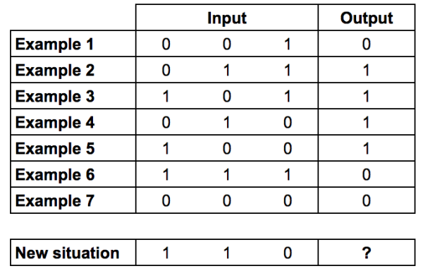 training_set_inputs = array([[0, 0, 1], [1, 1, 1], [1, 0, 1], [0, 1, 1],[1,1,0],[0,1,0],[0,0,0]])