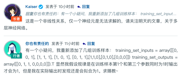 比如在集智的文章评论区中,有朋友尝试了修改在线编辑器的参数重新定义了问题:“第一列与第三列同时为1->1,否则->0”,但经过训练后在[1 0 0]这个测试样本上仍然得到的是输出1。