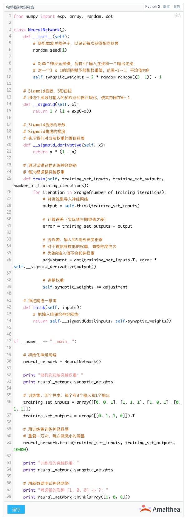.T函数就是矩阵转置。我想现在可以来看看美化版的源代码了,最后我还会提出自己的终极思考。源代码中已经添加了注释逐行解释。注意每次迭代我们都一并处理了整个训练集,以下为完整的Python示例: