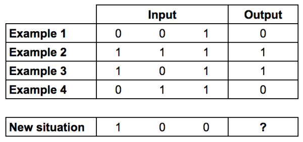 training_set_inputs = array([[0, 0, 1], [1, 1, 1], [1, 0, 1], [0, 1, 1]])