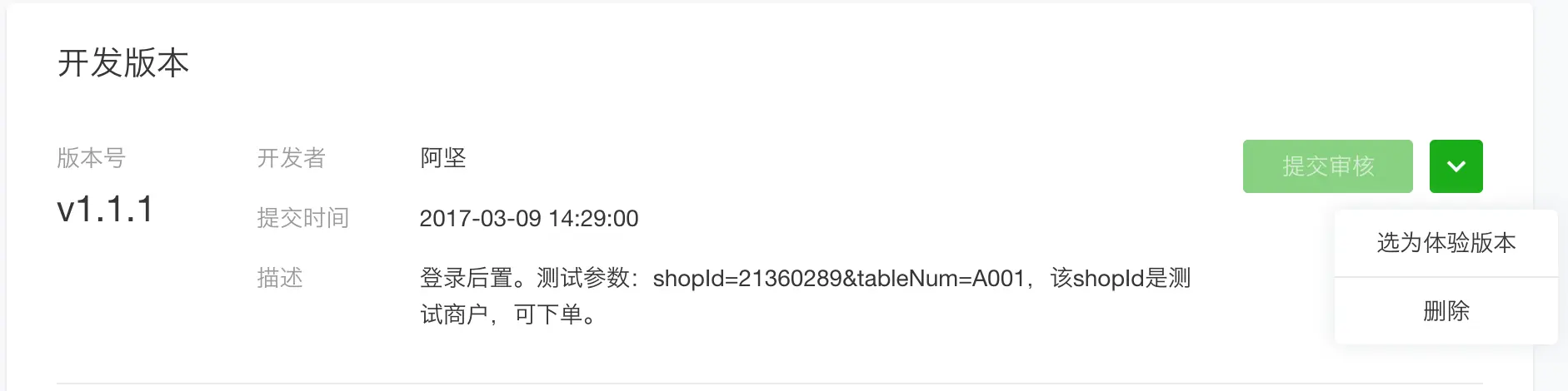 登录到微信公众平台,可以查看到自己刚刚提交的代码版本