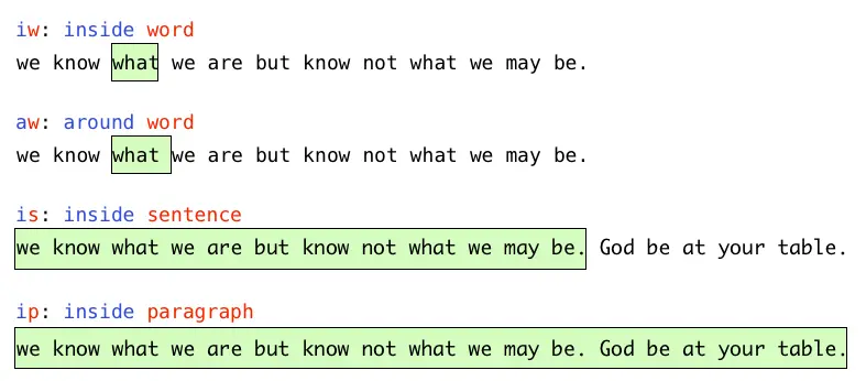 名词代表了我们即将处理的文本。Vim 中有一个专门的术语叫做文本对象(text object),下面是一些文本对象的示例: