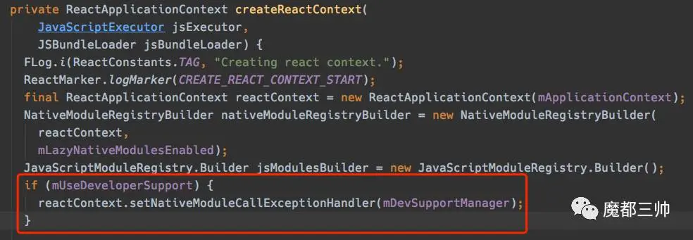 但是它只在develop support时才起作用!所以如果我们希望要捕获这里的崩溃,就必须做一点改动。我们可以像设给CatalystInstance的一样,在使用develop support时设给它DevSupportManagerImpl,否则使用传入的 NativeModuleExceptionHandler。
