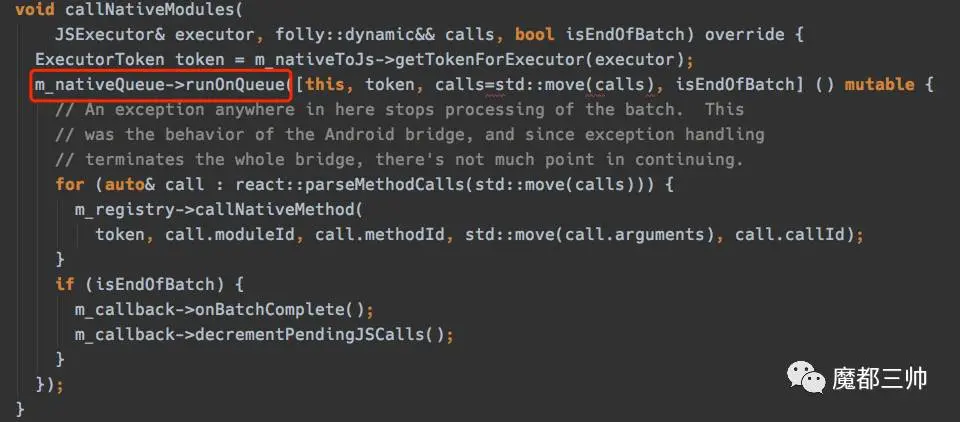 由于调用Native模块函数时,会通过MessageQueue.js走到C++层Bridge中,在这个调用链的C++层最后一个关卡 NativeToJsBridge.cpp中可以看到它的真身: