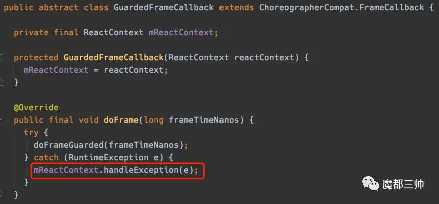 每一个操作都是进入操作队列,由Choreographer进行调度,这个DispatchUIFrameCallback其实就是一个 Choreographer.FrameCallback,在每次doFrame时候将队列内的操作flush并执行,但是它在RN中被包装了一层: GuardedFrameCallback.java: