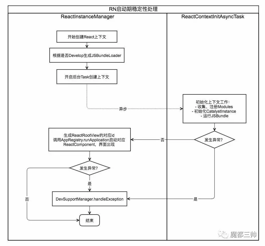 上面保护的都是在AsyncTask执行期内的问题,这块做的事情也最多,最复杂,所以RN也只在这里做了崩溃处理。至于预初始化期间,由于它也涉及了so加载的操作,可以在ReactRootView.startReactApplication外部再加一层try-catch,来保证捕获住所有启动期间的崩溃。